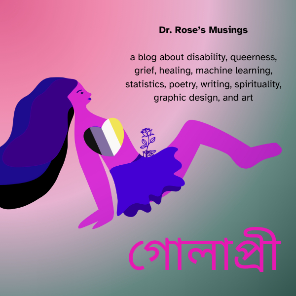 disability, queerness, grief, healing, machine learning, statistics, poetry, writing, spirituality, graphic design, and art